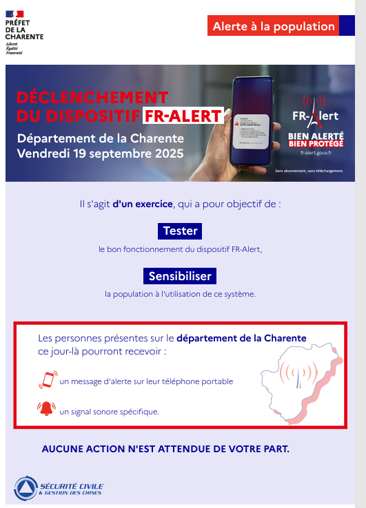 Un exercice départemental de diffusion d’alerte via le dispositif FR-Alert va être organisé en Charente.
